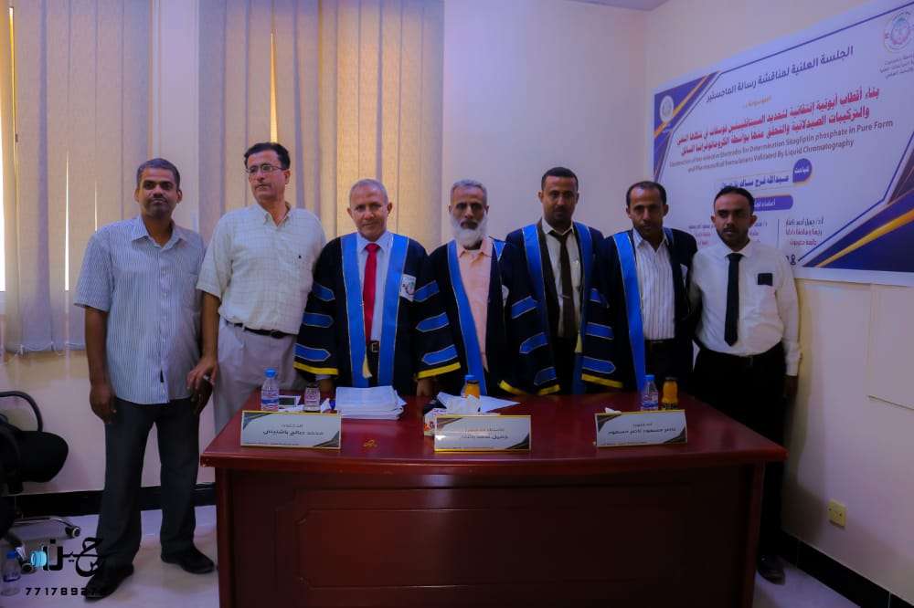 نوقشت صباح اليوم بجامعة حضرموت نيابة الدراسات العليا والبحث العلمي الجلسة العلنية لرسالة الماجستير والموسومة بـ بناء أقطاب أيونية إنتقائية لتحديد السيتاقليبتين فوسفات في شكلها النقي والتركيبات الصيدلانية والتحقق منها بواسطة الكروماتوغرافيا السائل، والمقدمة من الطالب الباحث عبدالله فرج بازمول بكلية العلوم قسم الكيمياء بالمكلا. وقد تكونت اللجنة الخاصة بالمناقشة من الأستاذ الدكتور جميل أحمد باغفار كرئيسا ومناقشا داخليا بجامعة حضرموت والدكتور محمد صالح باشنيني كمشرفا علميا بجامعة حضرموت والدكتور ناصر مسعود ناصر كمناقشا خارجيا بجامعة أبين،حيث تمت المناقشة بقاعة الدراسات العليا بكلية العلوم. وتهدف الدراسة إلى إيجاد مجموعة من الطرق البسيطة والمتاحة في تحديد دواء السيتاقليبتين لعلاج مرض السكر بطرق تحليلية جديدة ومبتكرة خاضعة للتقييم العلمي الدقيق، ودراسة التأثيراث الفيزيائية وتداخلات الأدوية على هذه الطريقة وإمكانية تحويل هذه الدراسة إلى منتج تسويقي. بالآخير قدّم المشرفون مجموعة من الملاحظات والتوصيات التي تهدف الى تحسين وتطوير مضمون الرسالة، بعدها تم اعلان النتيجة النهائية لجلسة المناقشة والتي أُعلنت بإعطاء الباحث عبدالله فرج بازمول درجة الإمتياز من جامعة حضرموت كلية العلوم قسم الكيمياء بالمكلا،وسط حضور من قبل أهالي الباحث ومجموعة من الدكاترة والطلاب من مختلف الأقسام بجامعة حضرموت.