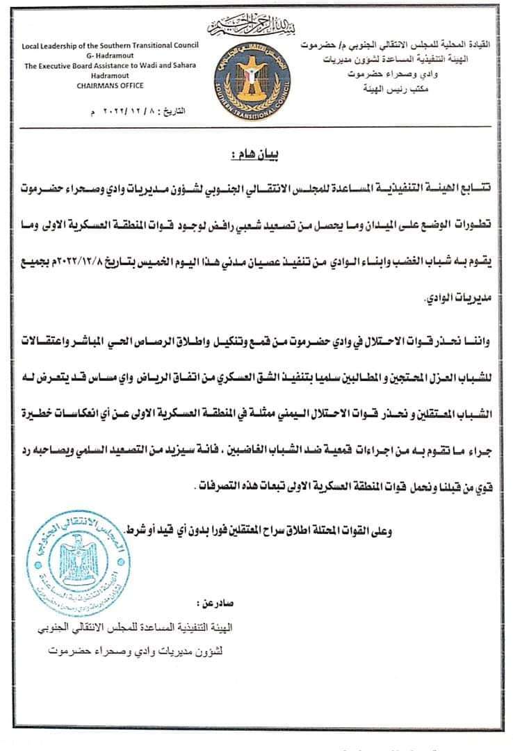 اصدرت الهيئة التنفيذية المساعدة للمجلس الانتقالي الجنوبي لشؤون مديريات وادي وصحراء حضرموت بيان هام حذرت فيه قوات المنطقة العسكرية الأولى من القمع والتنكيل بالمحتجين السلميين العزل وتطالب بإطلاق سراح الشباب المعتقلين دون شروط . وجاء نص البيان كالتالي: بيان هام : تتابع الهيئة التنفيذية المساعدة للمجلس الانتقالي الجنوبي لشؤون مديريات وادي وصحراء حضرموت تطورات الوضع على الميدان وما يحصل من تصعيد شعبي رافض لوجود قوات المنطقة العسكرية الاولى وما يقوم به شباب الغضب وأبناء الوادي من تنفيذ عصيان مدني هذا اليوم الخميس بتاريخ ٢٠٢٢/١٢/٨ م بجميع مديريات الوادي. واننا نحذر قوات الاحتلال في وادي حضرموت من قمع وتنكيل واطلاق الرصاص الحي المباشر واعتقالات للشباب العزل المحتجين والمطالبين سلميا بتنفيذ الشق العسكري من اتفاق الرياض واي مساس قد يتعرض له الشباب المعتقلين ونحذر قوات الاحتلال اليمني ممثلة في المنطقة العسكرية الاولى عن أي انعكاسات خطيرة جراء ما تقوم به من اجراءات قمعية ضد الشباب الغاضبين ، فانة سيزيد من التصعيد السلمي ويصاحبه رد قوي من قبلنا ونحمل قوات المنطقة العسكرية الاولى تبعات هذه التصرفات. وعلى القوات المحتلة اطلاق سراح المعتقلين فورا بدون أي قيد أو شرط. صادر عن؛ الهيئة التنفيذية المساعدة للمجلس الانتقالي الجنوبي لشؤون مديريات وادي وصحراء حضرموت #تحرير_الوادي_مطلب_حضرموت