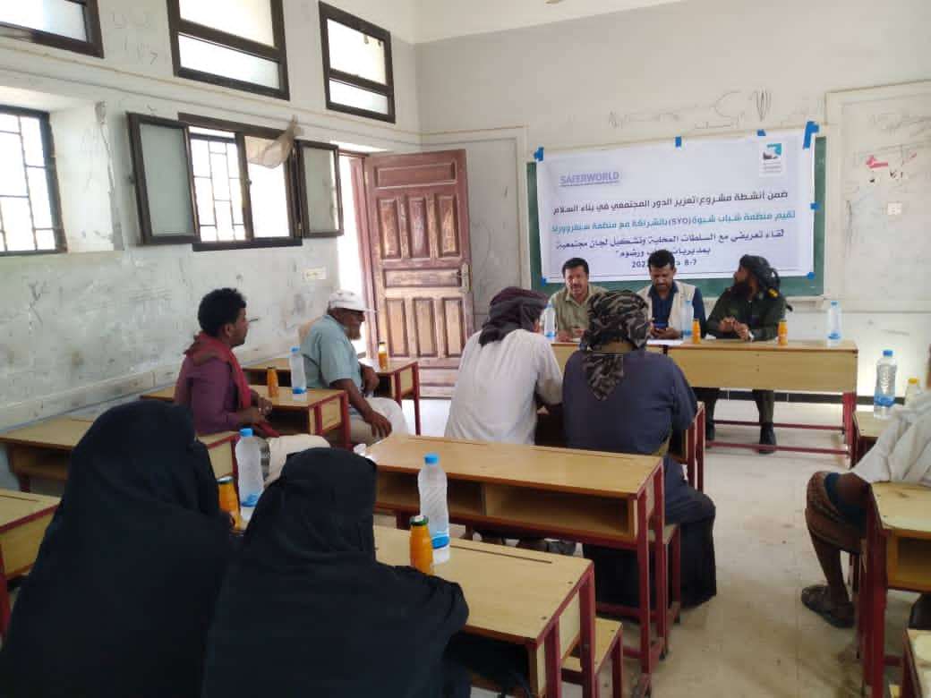 نظم اليوم في مدينة عين بامعبد بمديرية رضوم محافظة شبوة لقاء تعريفي بين منظمة شباب شبوة بالشراكة مع منظمة سيفروولد وبين السلطة المحلية في المديرية برئاسة مدير عام المديرية هادي سعيد الخرماء . وخلال اللقاء الذي حضره مدير مشروع تعزيز الدور المجتمعي في بناء السلام التابع لمنظمة شباب شبوة عوض المصعبي والقائم بأعمال مدير عام الشرطة بالمديرية الملازم احمد بامعبد وعدد من الشخصيات الرسمية والمجتمعية بالمديرية ناقش الحاضرون تدخلات وأهداف المشروع في حل المشكلات المجتمعية ومساعدة السلطة المحلية في وضع الحلول المناسبة واللازمة للتغلب عليها وحلها . وقد تمخض عن اللقاء إختيار لجنة مجتمعية للمشروع بالمديرية من خمسة أعضاء وفقا للمعايير والشروط التي تختارها المنظمة حيث ستعمل لهم عدد من الدورات لتعزيز قدراتهم ومهاراتهم والتطبيق العملي لها .
