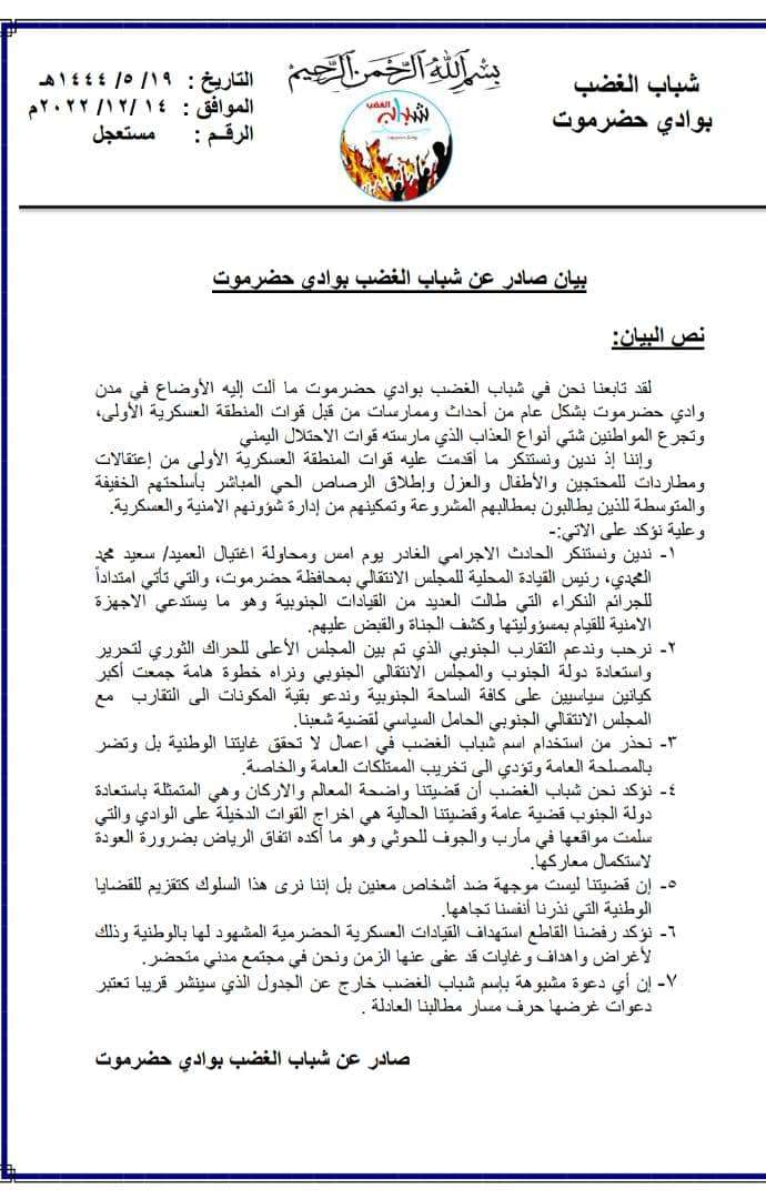 بيان صادر عن شباب الغضب بوادي حضرموت.