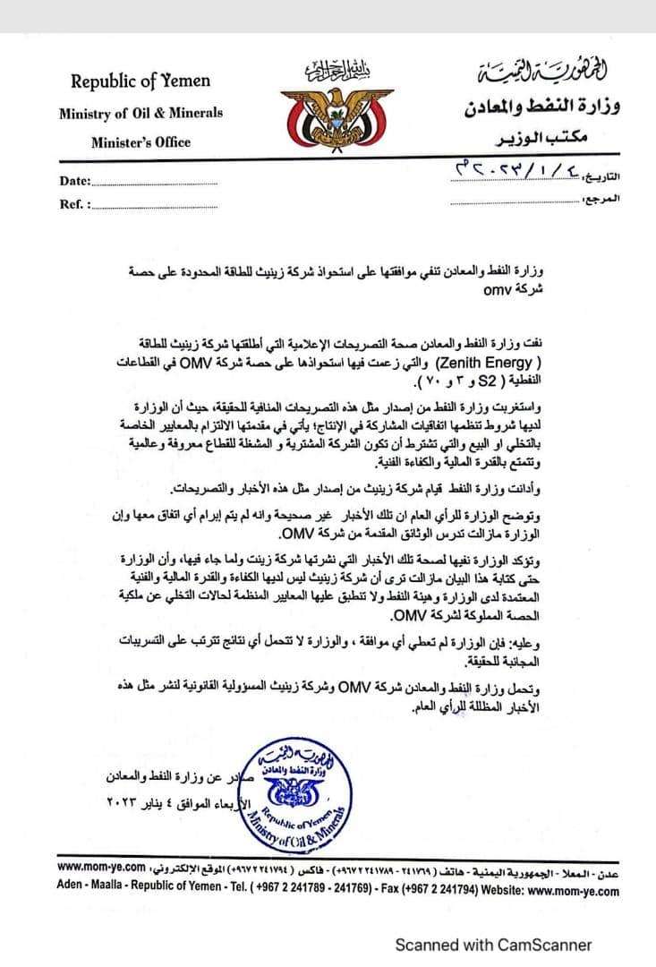 نفت وزارة النفط والمعادن صحة التصريحات الإعلامية التي أطلقتها شركة زينث للطاقة ( Zenith Energy) والتي زعمت فيها استحواذها على حصة شركة OMV في القطاعات النفطية ( S2 و 3 و 70 ). واستغربت وزارة النفط من إصدار مثل هذه التصريحات المجانبة للحقيقة، حيث أن الوزارة لديها شروط تنظمها اتفاقيات المشاركة في الإنتاج؛ يأتي في مقدمتها الإلتزام بالمعايير الخاصة بالتخلي والتي تشترط في حالة التخلي أن تكون الشركة معروفة وعالمية وتتمتع بالقدرة المالية والكفاءة الفنية. وأدانت وزارة النفط قيام شركة زينث بإصدار مثل هذه الأخبار والتصريحات. وتوضح الوزارة للرأي العام ان تلك الأخبار غير صحيحة وانه لم يتم إبرام أي اتفاق معها وإن الوزارة مازالت تدرس الوثائق المقدمة من شركة OMV ولم يتم البت بهذا الموضوع. وتؤكد الوزارة نفيها لصحة تلك الأخبار ولما جاء فيها، وأن الوزارة حتى كتابة هذا البيان مازالت ترى أن شركة زينيث ليس لديها الكفاءة والقدرة المالية والفنية المعتمدة لدى الوزارة وهيئة النفط ولا تنطبق عليها المعايير المنظمة لحالات التخلي عن ملكية الحصة المملوكة لشركة OMV. وعليه: فإن الوزارة لم تعطي أي موافقة أو إشارة لقبول الشركة ، والوزارة لا تتحمل أي نتائج تترتب على التسريبات المجانبة للحقيقة. وتحمل وزارة النفط والمعادن شركة OMV وشركة زينيث المسؤولية القانونية لنشر مثل هذه الأخبار المظللة للرأي العام. صادر عن وزارة النفط والمعادن الأربعاء الموافق 4 يناير 2023