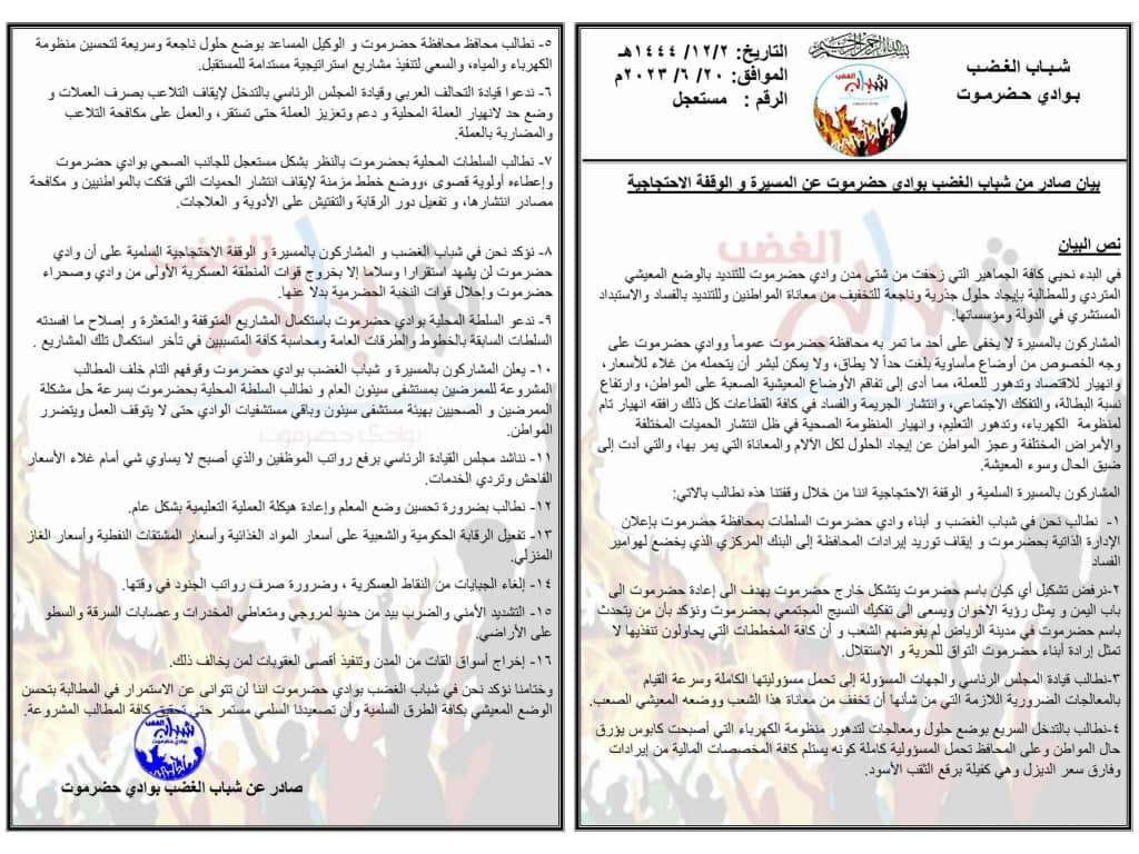نص البيان بسم الله الرحمن الرحيم في البدء نحيي كافة الجماهير والشخصيات الاجتماعية ونقابة المعلمين والتربويين الجنوبيين م/ حضرموت على زحفهم من شتى مدن وادي حضرموت للتنديد بالوضع المعيشي المتردي وللمطالبة بإيجاد حلول جذرية وناجعة للتخفيف من معاناة المواطنين وللتنديد بالفساد والاستبداد المستشري في الدولة ومؤسساتها٠ المشاركون بالمسيرة لا يخفى على أحد ما تمر به محافظة حضرموت عموماً ووادي حضرموت على وجه الخصوص من أوضاع مأساوية بلغت حداً لا يطاق، ولا يمكن لبشر أن يتحمله من غلاء للأسعار، وانهيار للاقتصاد وتدهور للعملة، مما أدى إلى تفاقم الأوضاع المعيشية الصعبة على المواطن، وارتفاع نسبة البطالة، والتفكك الاجتماعي، وانتشار الجريمة والفساد في كافة القطاعات كل ذلك رافقه انهيار تام لمنظومة الكهرباء، وتدهور التعليم، وانهيار المنظومة الصحية في ظل انتشار الحميات المختلفة والأمراض المختلفة وعجز المواطن عن إيجاد الحلول لكل الآلام والمعاناة التي يمر بها، والتي أدت إلى ضيق الحال وسوء المعيشة٠ المشاركون بالمسيرة السلمية والوقفة الاحتجاجية اننا من خلال وقفتنا هذه نطالب بالاتي: 1- نطالب نحن في شباب الغضب وأبناء وادي حضرموت السلطات بمحافظة حضرموت بإعلان الإدارة الذاتية بحضرموت وإيقاف توريد إيرادات المحافظة إلى البنك المركزي الذي يخضع لهوامير الفساد٠ 2- نرفض تشكيل أي كيان باسم حضرموت يتشكل خارج حضرموت يهدف الى إعادة حضرموت الى باب اليمن ويمثل رؤية الاخوان ويسعى الى تفكيك النسيج المجتمعي بحضرموت ونؤكد بأن من يتحدث باسم حضرموت في مدينة الرياض لم يفوضهم الشعب وأن كافة المخططات التي يحاولون تنفذيها لا تمثل إرادة أبناء حضرموت التواق للحرية والاستقلال٠ 3- نطالب قيادة المجلس الرئاسي والجهات المسؤولة إلى تحمل مسؤوليتها الكاملة وسرعة القيام بالمعالجات الضرورية اللازمة التي من شأنها أن تخفف من معاناة هذا الشعب ووضعه المعيشي الصعب٠ 4- نطالب بالتدخل السريع بوضع حلول ومعالجات لتدهور منظومة الكهرباء التي أصبحت كابوس يؤرق حال المواطن وعلى المحافظ تحمل المسؤولية كاملة كونه يستلم كافة المخصصات المالية من إيرادات وفارق سعر الديزل وهي كفيلة برقع الثقب الأسود٠ 5- نطالب محافظ محافظة حضرموت والوكيل المساعد بوضع حلول ناجعة وسريعة لتحسين منظومة الكهرباء والمياه، والسعي لتنفيذ مشاريع استراتيجية مستدامة للمستقبل٠ 6- ندعوا قيادة التحالف العربي وقيادة المجلس الرئاسي بالتدخل لإيقاف التلاعب بصرف العملات ووضع حد لانهيار العملة المحلية ودعم وتعزيز العملة حتى تستقر، والعمل على مكافحة التلاعب والمضاربة بالعملة٠ 7- نطالب السلطات المحلية بحضرموت بالنظر بشكل مستعجل للجانب الصحي بوادي حضرموت وإعطاءه أولوية قصوى ،ووضع خطط مزمنة لإيقاف انتشار الحميات التي فتكت بالمواطنيين ومكافحة مصادر انتشارها، وتفعيل دور الرقابة والتفتيش على الأدوية و العلاجات٠ 8- نؤكد نحن في شباب الغضب والمشاركون بالمسيرة والوقفة الاحتجاجية السلمية على أن وادي حضرموت لن يشهد استقرارا وسلاما إلا بخروج قوات المنطقة العسكرية الأولى من وادي وصحراء حضرموت وإحلال قوات النخبة الحضرمية بدلا عنها٠ 9- ندعو السلطة المحلية بوادي حضرموت باستكمال المشاريع المتوقفة والمتعثرة وإصلاح ما افسدته السلطات السابقة بالخطوط والطرقات العامة ومحاسبة كآفة المتسببين في تأخر استكمال تلك المشاريع٠ 10- يعلن المشاركون بالمسيرة وشباب الغضب بوادي حضرموت وقوفهم التام خلف المطالب المشروعة للممرضين بمستشفى سيئون العام ونطالب السلطة المحلية بحضرموت بسرعة حل مشكلة الممرضين والصحيين بهيئة مستشفى سيئون وباقي مستشفيات الوادي حتى لا يتوقف العمل ويتضرر المواطن٠ 11- نناشد مجلس القيادة الرئاسي برفع رواتب الموظفين والذي أصبح لا يساوي شي أمام غلاء الأسعار الفاحش وتردي الخدمات٠ 12- نطالب بضرورة تحسين وضع المعلم وإعادة هيكلة العملية التعليمية بشكل عام٠ 