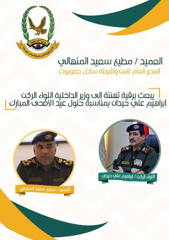 بعث المدير العام لأمن وشرطة ساحل حضرموت، العميد مطيع سعيد المنهالي، برقية تهنئة إلى محافظ حضرموت رئيس اللجنة الأمنية، الأستاذ مبخوت مبارك بن ماضي، بمناسبة حلول عيد الأضحى المبارك . وجاء في برقية التهنئة ”يطيب لي أن أبعث لسيادتكم ومن خلالكم إلى أهلنا في حضرموت، باسم كافة ضباط وصف الضباط وأفراد الأمن والشرطة، أسمى وأعظم آيات التهاني وأطيب الأمنيات بمناسبة حلول عيد الأضحى المبارك، داعياً المولى جل وعلا أن يُعيده على سيادتكم، وعلى كافة أهلنا في حضرموت، وعلى الأمتين العربية والإسلامية بالخير واليمن والبركات“ . واضاف في البرقية ”ومع حلول هذه المناسبة الأيمانية الكريمة التي تتجلى فيها أعظم صور التضحية والفداء فإن رجال الأمن والشرطة يؤكدون استعدادهم الكامل لبذل الجهد والعطاء للوفاء بالمهام والمسئوليات المقدسة التي يحملون أمانتها للحفاظ على أمن وسلامة الوطن والمواطن، متمسكين بالمبادئ والقيم التي تحفظ محافظتنا قوية رائدة تحت قيادتكم الوطنية الحكيمة، حفظكم الله وأيد خطاكم، وكل عام وأنتم بخير“ .