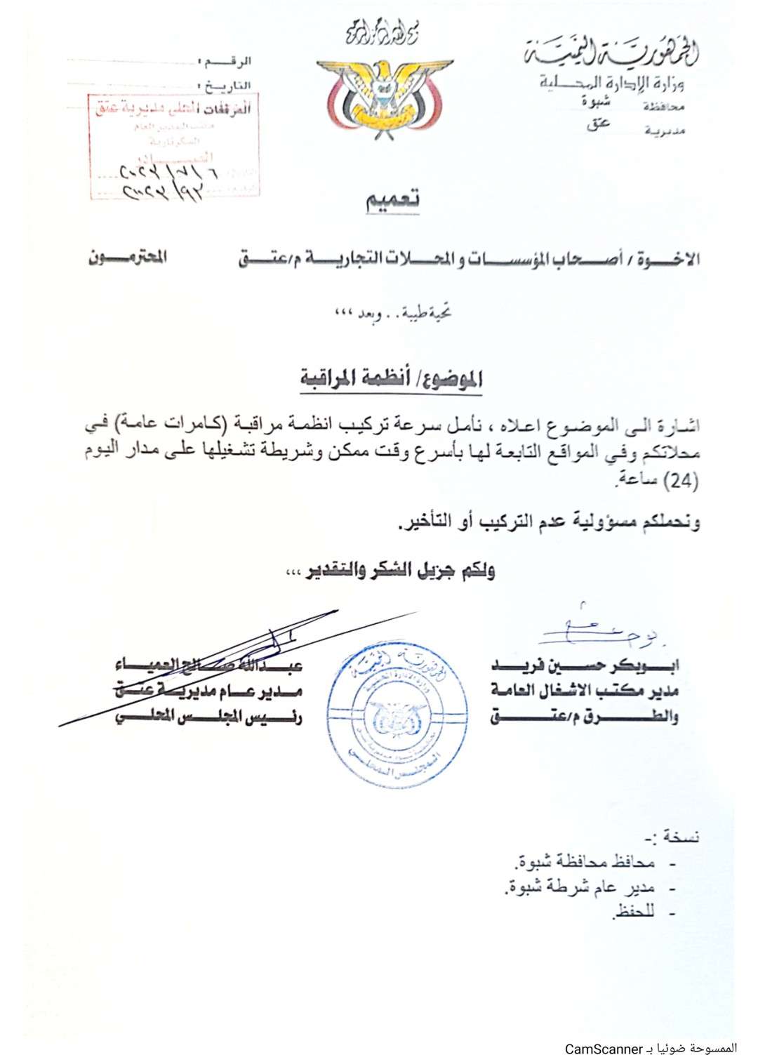 السلطة المحلية بمديرية عتق تلزم أصحاب المحلات والمؤسسات والشركات التجارية بتركيب كاميرات على محلاتهم التجارية