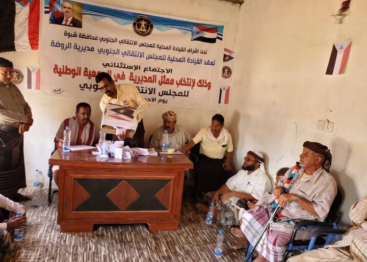 تحت اشراف القيادة المحلية للمجلس الانتقالي بمحافظة شبوة عقدت القيادة المحلية للمجلس الانتقالي بمديرية الروضه صباح اليوم الاحد الاجتماع الاستثنائي لانتخاب ممثل المديرية في الجمعية الوطنية للمجلس الانتقالي ، وبحضور اعضاء القياده المحليه بالمحافظة الاستاذ ناصر التومه القميشي والاستاذ صالح لحمر باعوضه واعضاء القيادة المحليه بالمديريه وبعض الشخصيات الاجتماعيه والاداريه بالمديريه. حيث بدا الاجتماع بتلاوة آيات من القرآن الكريم ثم النشيد الوطني الجنوبي ، ثم رحب رئيس الهيئة التنفيذية لانتقالي مديرية الروضة الاستاذ توفيق عبدالله المسب بإعضاء الجمعية وجميع الحضور والضيوف من الشخصيات الاجتماعية والإدارية. وتطرق المسب إلى الأهمية التي يحظى بها الاجتماع الاستثنائي للقيادة المحلية بالمديرية ، باعتباره يأتي ضمن عملية سياسية وتنظيمية واسعة يقودها المجلس الانتقالي تتمثل في إعادة البنية التنظيمية للمجلس وتطويرها ، ومن ضمنها انتخاب أعضاء جدد للجمعية الوطنية . كما أعرب عضو القيادة المحلية لانتقالي المحافظة الاستاذ ناصر صالح باجيل عن سعادته بمشاركة انتقالي مديرية الروضة تدشين الاجتماع الاستثنائي لانتخاب ممثل المديرية للجمعية الوطنية داعيآ الجميع للتكاثف وبدل المزيد من الجهد من اجل المديريه خاصه والجنوب عامه في السير بخطى ثابثة لاجل استعادة دولتنا الجنوبيه كاملة السيادة ... واسفر اجتماع القيادة المحلية في مديرية الروضة عن انتخاب الاستاذصالح سعيد لحمر باعوضه لعضوية الجمعية الوطنية ب23 صوت من اصل 37 صوت, مقابل 13 صوت حصل عليها المرشح المنافس الدكتور صالح سعيد جميع. وفي ختام الاجتماع بارك الحاضرون فوز المرشح صالح لحمر ونجاح الاجتماع الاستثنائي الانتخابي.