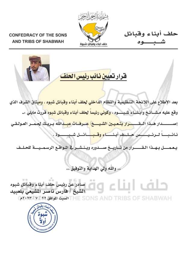 أصدر الشيخ فارس بن ناصر الخبيلي المشيعي رئيس حلف أبناء وقبائل شبوة قرارا بتعيين الشيخ عرفات عبدالله بريك الاحمر العولقي نائبا لرئيس حلف أبناء وقبائل شبوة . وجاء وفي نص القرار مايلي : (بعد الاطلاع على اللائحة التنظيمية والنظام الداخلي لحلف أبناء وقبائل شبوة ، قررنا إصدار هذا القرار بتعيين الشيخ عرفات عبدالله بريك لحمر العولقي نائبا لرئيس حلف أبناء وقبائل شبوة ، ويعمل بهذا القرار من تاريخ صدوره وينشر في المواقع الرسمية للحلف). الشيخ فارس ناصر الخبيلي المشيعي بلعبيد 22 يوليو 2023