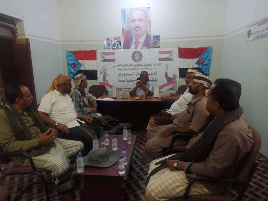 عقدت الهيئة التنفيذية للقيادة المحلية للمجلس الانتقالي الجنوبي بمديرية القطن مساء امس اجتماعها الدوري لشهر يوليو 2023م برئاسة رئيس الهيئة محمد حسين الحداد. وفي الاجتماع رحبت الهيئة التنفيذية بعودة الرئيس القايد عيدروس قاسم الزبيدي ونوابه والوفد المرافق له بعد زياراته الخارجية' كما تم في الاجتماع استعراض التقرير بين الدورتين واطلاع اعضاء الهيئة على نتائج الدورة الثانية للقيادة المحلية بالمحافظة' ومناقشة تقرير حول حقوق الانسان والحريات للفصل الثاني من العام الجاري والمصادقة عليه. كما تم في الاجتماع اقرار عقد الاجتماع الدوري الثاني لاعضاء القيادة المحلية خلال الأيام القادمة واقرار تنفيذ مخيم صيفي لطلاب وطالبات الثانوية منتصف الاسبوع القادمة لمدة ثلاثة أسابيع بالتنسيق مع معهد موهبتي للتدريب والتأهيل.