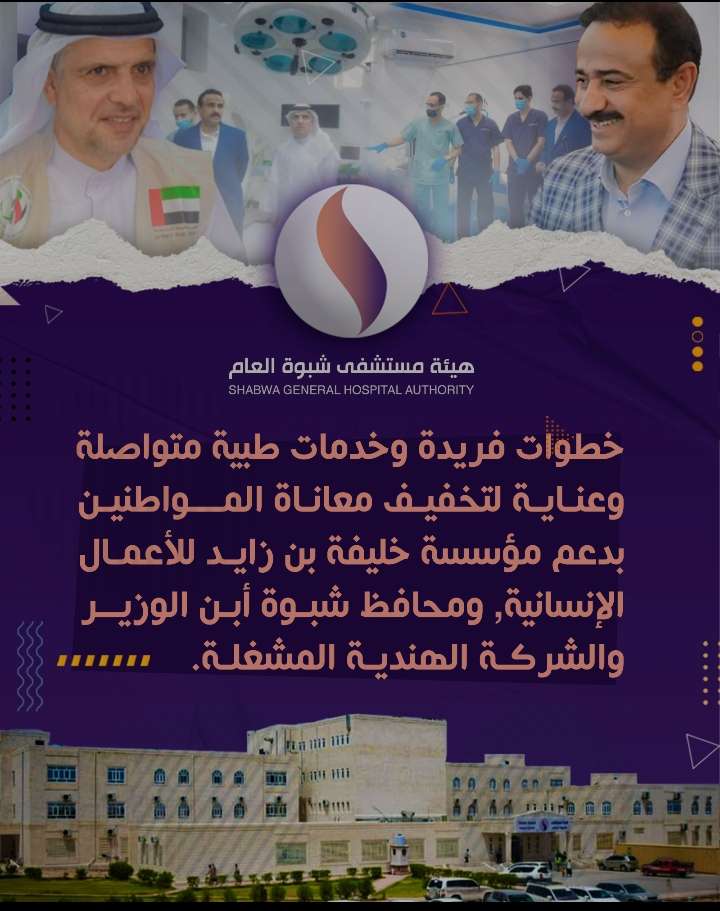 بدعم إماراتي هيئة مستشفى شبوة خطوات فريدة وخدمات طبية متواصلة وعناية لتخفيف معاناة المواطنين.