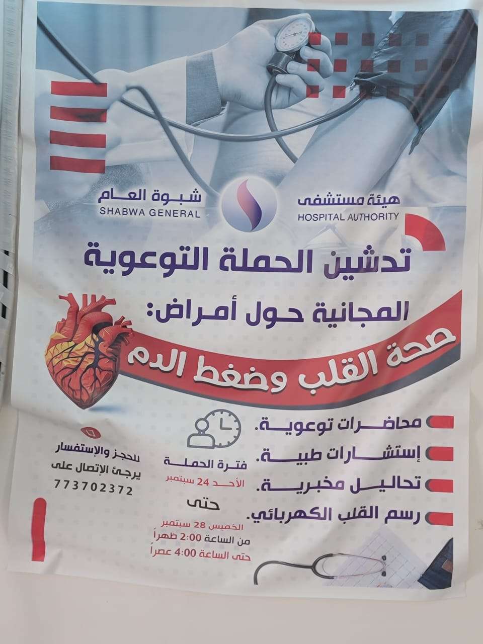 اعلنت هيئة مستشفى شبوة العام اليوم عن تدشين حملة توعوية حول امراض صحة القلب وضغط الدم والتي سوف تبدا يوم الأحد القادم. وتشمل الحملة التوعوية المجانية محاضرات توعوية واستشارات طبية وتحاليل مخبرية ورسم القلب الكهربائي. هذا وتستمر الحملة حتى 28 من سبتمبر 2023م.