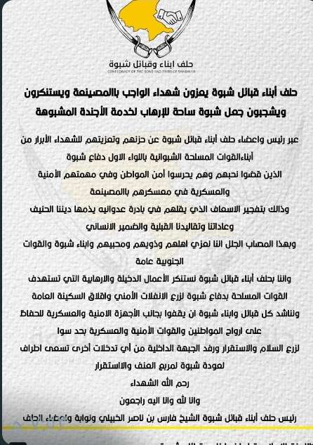 حلف أبناء قبائل شبوة يعزون شهداء الواجب باالمصينعة ويستنكرون ويشجبون جعل شبوة ساحة للإرهاب لخدمة الأجندة المشبوهة