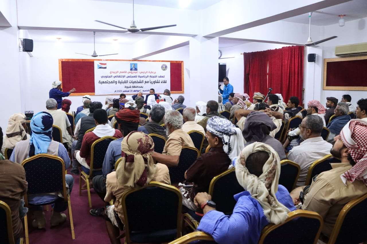 فريق هيئة الرئاسة يعقد لقاءً تشاورياً مع الشخصيات القبلية والمجتمعية بمحافظة شبوة.