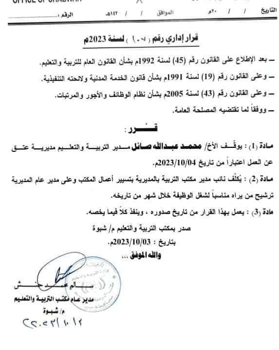 أصدر مدير عام مكتب التربية والتعليم بمحافظة شبوة الاستاذ سالم محمد حنش، قراراً بشأن مكتب التربية والتعليم بمديرية عتق. وجاء نص القرار ؛ مادة ( 1 ) يوقف مدير مكتب التربية والتعليم عتق الاستاذ محمد عبدالله صائل عن العمل اعتباراً من 4 أكتوبر 2023 م المادة ( 2 ) يكلف نائب مدير مكتب التربية والتعليم عتق القيام بتسيير ألاعمال وعلى مدير عام مديرية عتق يرشح من يراه مناسبا لشغل الوظيفة خلال شهر من هذا التكليف . مادة (3) العمل بهذه القرار من تاريخ صدوره والتنفيذ كلاً فيما يخصه