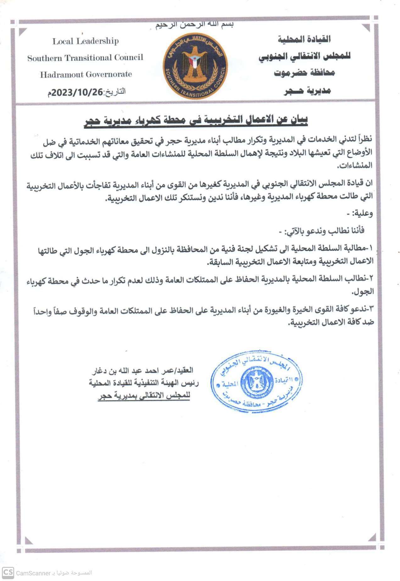 انتقالي حجر بحضرموت يدين الاعمال التخريبية التي طالت محطة كهرباء المديرية.