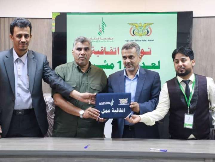 الوكيلان باصريح والجيلاني يوقعا اتفاقية عمل لـ 15 مشروع بساحل حضرموت بقيمة 280 ألف دولار بتمويل وتنفيذ من إسناد للتنمية والأعمال الإنسانية