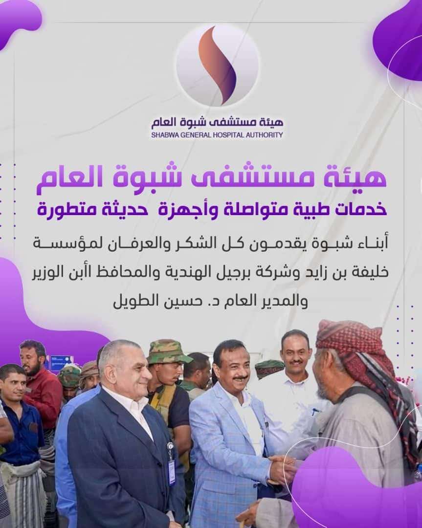 بمتابعة ودعم محافظ شبوة الشيخ عوض ابن الوزير ومؤسسة خليفة بن زايد للأعمال الإنسانية وشركة برجيل الهندية المشغلة تواصل هيئة شبوة العام تقديم خدماتها الطبية والصحية لأبناء محافظة شبوة، بعد ان قدمت خدمات مجانية منذ إفتتاح هيئة مستشفى شبوة العام، في مايو من العام المنصرم، بعاصمة المحافظة، عتق. داخل هيئة مستشفى شبوة العام وقال المريض أحمد علي الدهولي الذي تعرض لإصابة بالغة، انه وصل إلى مستشفى شبوة في وضع صحي حرج، ليتلقى العلاج والتدخلات الجراحية اللازمة، من قبل كوادر طبية، والتي تمكنت بفضل من الله إعادة روح الحياة إليه، بعد ان تلقى العناية من قبل الهيئة مباشرة دون تأخير، حيث تم إجراء عملية جراحية ناجحة. وخلال إقامته في المستشفى تلقى علاجات ورعاية طبية كاملة ونظيفة، تحت إشراف أطباء متخصصين. لم يكن أحمد الدهولي الوحيد الذي أجريت له عملية نوعية في هيئة مستشفى شبوة العام، بل هناك الكثير من المرضى الذين تم علاجهم من أبناء شبوة والمحافظات المجاورة لها، في ظل الإهتمام المتواصل من قبل قيادة السلطة المحلية بشبوة والمتمثلة في محافظها الشيخ عوض ابن الوزير، ومؤسسة خليفة بن زايد للأعمال الإنسانيةوشركة برجيل بتقديم الرعاية الطبية والصحية المجانية، من خلال الإستمرار في إدخال الأقسام الطبية المختلفة خلال الفترات القادمة. وفي حديث لمدير مكتب العلاقات العامة بمحافظة شبوة الأستاذ علي الحاتلة، شكر فيه مؤسسة خليفة بن زايد للأعمال الإنسانية على دعمها الغير عادي في المحافظة، والتي وفرت على المرضى رحلات وعذاب السفر في الطرقات إلى المحافظات الأخرى والخارج، وصرح الدكتور حسين الطويل مدير عام هيئة مستشفى شبوة العام، قائلاً: ((منذ إفتتاح هيئة مستشفى شبوة العام تم تقديم أكثر من نصف مليون خدمة طبية، مابين زيارات العيادات الخارجية والطوارئ وإجراء الفحوصات والأشعات للمرضى، وكذلك تم إجراء أكثر من 5000آلاف عملية جراحية، معظمها يندرج تحت العمليات المتقدمة ذات المهارة الخاصة، مثل جراحة العظام وجراحة المسالك البولية)). بتصرف. عدن المستقلة. عدن الحدث