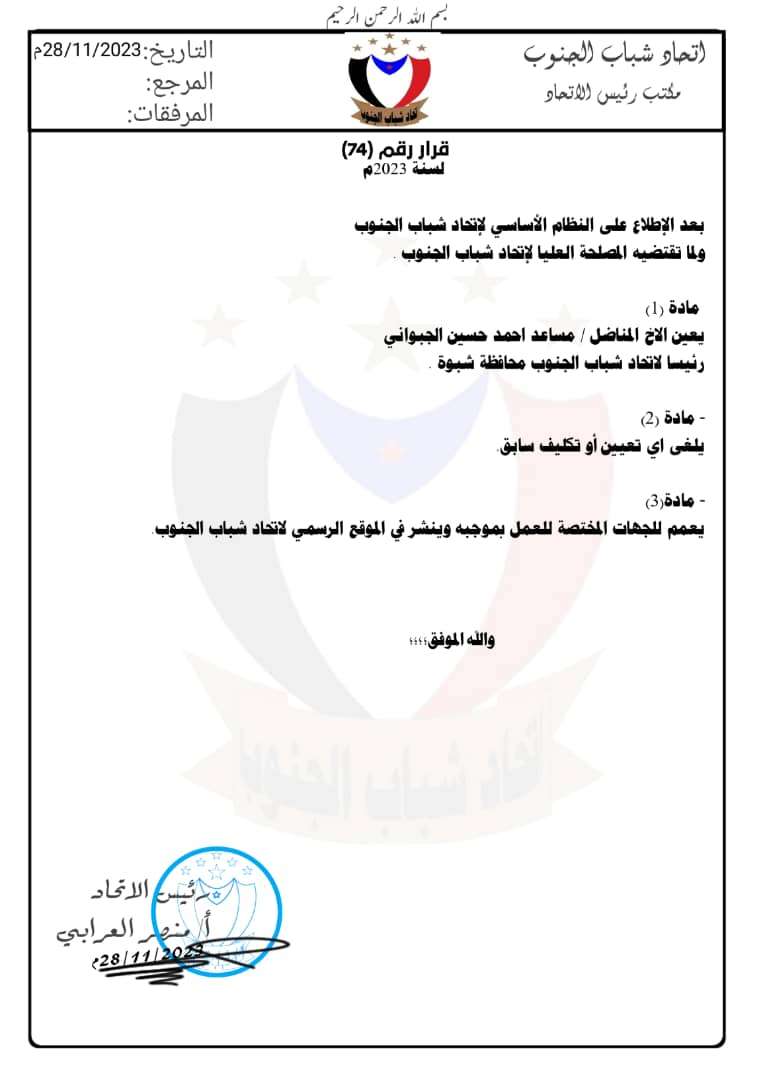 اصدر رئيس إتحاد شباب الجنوب الأستاذ منصر يوسف العرابي قراراً بتعين بتعين مساعد احمد حسين الجبواني رئيساً لإتحاد شباب الجنوب محافظة شبوة ماده( 2) يلغى اي تعين اوتكليف سابق