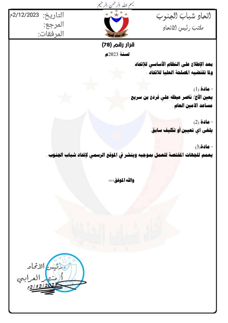 أصدر رئيس إتحاد شباب الجنوب الأستاذ منصر يوسف العرابي قراراً بتعيين الأستاذ ناصر عيضه علي قردع بن سريع مساعد الأمين العام لإتحاد شباب الجنوب مادة 2/ يلغى أي تعين أو تكليف سابق وهناك عمل دؤوب يعمل عليه اتحاد شباب الجنوب للهيكلة في كل مؤسساته ودوائره للرقي بالعمل المؤسساتي والبحث عن كوادر تدير العملية السياسية والجماهيرية بحصافة واستراتيجية حتى نيل التحرير والاستقلال الثاني
