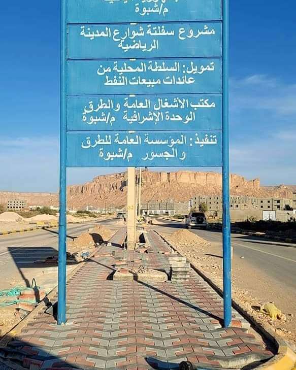 بمتابعة واهتمام محافظ محافظة شبوة رئيس المجلس المحلي الشيخ عوض محمد ابن الوزير" تتواصل أعمال مشروع صيانة وتأهيل عدد من شوارع مدينة عتق مركز محافظة شبوة" والذي تنفذه المؤسسة العامة للطرق والجسور فرع شبوة، وبإشراف مكتب الأشغال العامة والطرق وبتمويل السلطة المحلية بالمحافظة. وتتضمن أعمال المرحلة الثانية" لشوارع المدينة الرياضية والمتمثلة في الإنارة والتشجير إضافة إلى أعمال الانترلوك للجزيرة الوسطية على طول الشارعين. الجدير بالإشارة" أن هذه الأعمال تأتي ضمن توجهات السلطة المحلية برئاسة المحافظ ابن الوزير" لتحديث البنية التحتية لمركز المحافظة مدينة عتق، لتواكب ما تشهده من توسع عمراني وازدحام مروري وحركة تجارية ولإظهار واجهتها بالمظهر الحضاري الذي يليق بما تشهده من نهضة في مختلف الجوانب .