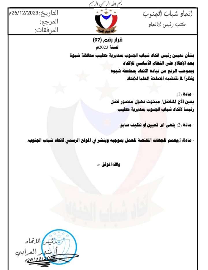 أصدر رئيس إتحاد شباب الجنوب الأستاذ منصر يوسف العرابي قراراً رقم (97) لسنة 2023م جاء فيه تعيين رئيس إتحاد شباب الجنوب بمديرية حطيب محافظة شبوة بعد الإطلاع على النظام الأساسي للإتحاد وبموجب الرفع من قيادة الاتحاد بمحافظة شبوة ونظراً لما تقتضيه المصلحة العليا للاتحاد - مادة (1) يعين المناضل مبخوت دهول منصور فضل رئيساً لاتحاد شباب الجنوب بمديرية حطيب - مادة (2) يلغى اي تعيين أو تكليف سابق. - مادة(3)يعمم للجهات المختصة للعمل بموجبه وينشر في الموقع الرسمي لإتحاد شباب الجنوب وتبذل قيادة إتحاد شباب الجنوب جهود كبيرة لهيكلة موسساتها في كل محافظات الجنوبية المحتل ومديريتها ومراكزها لخوض العمل السياسي لنيل الحرية والاستقلال وتقرير مصير الأمة الجنوبية لاستعادة مجدها