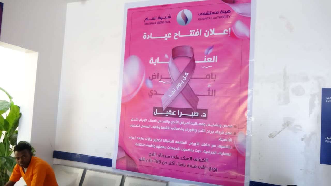 مازالت هيئة مستشفى شبوة العام تقدم خدماتها في جميع أقسامها بصورة راقية، كما عودتنا منذ إفتتاحها وهي في تقدم، لِتخفّف الصعاب على الكثير من المرضى، ويرجع الفضل بعد الله تعالى إلى محافظ المحافظة وإدارة الهيئة، والجهات الداعمة والمشغلة للمستشفى. حيث تم في الآونة الأخيرة إفتتاح عيادة أمراض الثدي، لتضاف إضافة جديدة إلى الخدمات التي يقدمها المستشفى. وقد صرحت الدكتورة صبرا عقيل إستشارية الجراحة العامة والمناظير العاملة بالمشفى، انه تم إفتتاح عيادة أمراض الثدي، وفي هذه العيادة يتم التعامل مع المريضات أو اللاتي يعانوا من أعراض تهمهن في تشخيص أو مراجعة أو متابعة هذه الامراض. كما قالت ان لدينا تعاون مع مركز الأورام، بحيث يتم معاينة الحالات التي قد تعاني من سرطان الثدي، كذلك الفحص المبكر وعمل الإجراءات لأخذ العينة النسيجية وإرسالها، ونكون جزء من الفريق الذي يتم مناقشة هذه الحالات دورياً، ومناقشة حالات سرطانات الثدي ومعالجتها، ونتعاون معهم، ونكمل مهامهم التي يبذلون فيها جهد غير عادي. كما شكرت الدكتورة صبرا مؤسسة خليفة بن زايد للأعمال الإنسانية على دعمهم الدائم والمستمر في تطوير هيئة مستشفى شبوة العام وشركة بريجيل الهندي المشغلة وعيادة أمراض الثدي. من أجل الإرتقاء بهذه الخدمات خصوصاً في المجتمع الذي نعيش فيه والذي يتعطش لمثل هذه الخدمات التي يوفرها المستشفى. كما شكرت القيادة الرشيدة والمتمثلة بالدكتور حسين الطويل والدكتور سيف الدين على كل مايقوموا به من افكار مبدعة لسد الثغرات في القطاع الصحي بمحافظة شبوة.