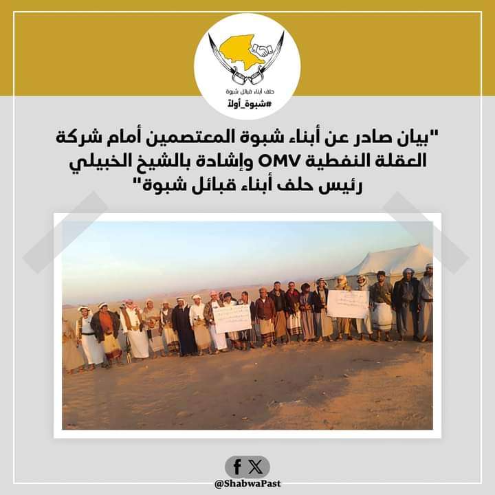 بيان صادر عن أبناء شبوة المعتصمين أمام شركة العقلة النفطية OMV وإشادة بالشيخ الخبيلي رئيس حلف أبناء قبائل شبوة "