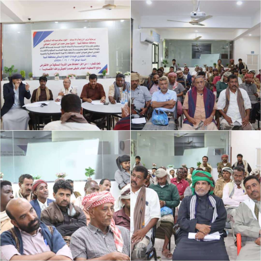 برعاية الوزير السقطري والمحافظ ابن الوزير وبحضور وكيل وزارة الزراعة والأسماك الكربي انعقاد اللقاء التشاوري لقيادات القطاع السمكي بمحافظة شبوة