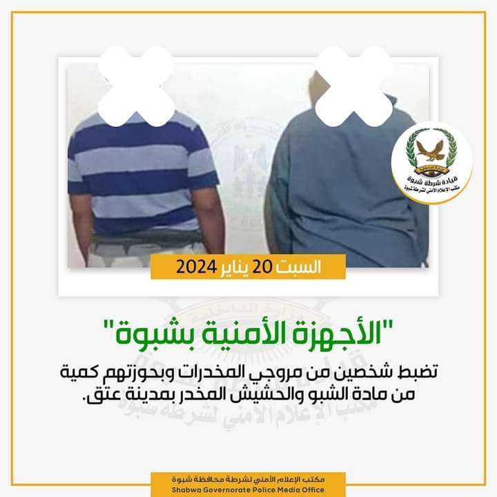 الأجهزة الأمنية بشبوة" تضبط شخصين من مروجي المخدرات وبحوزتهم كمية من ماده الشبو والحشيش المخدر بمدينة عتق .