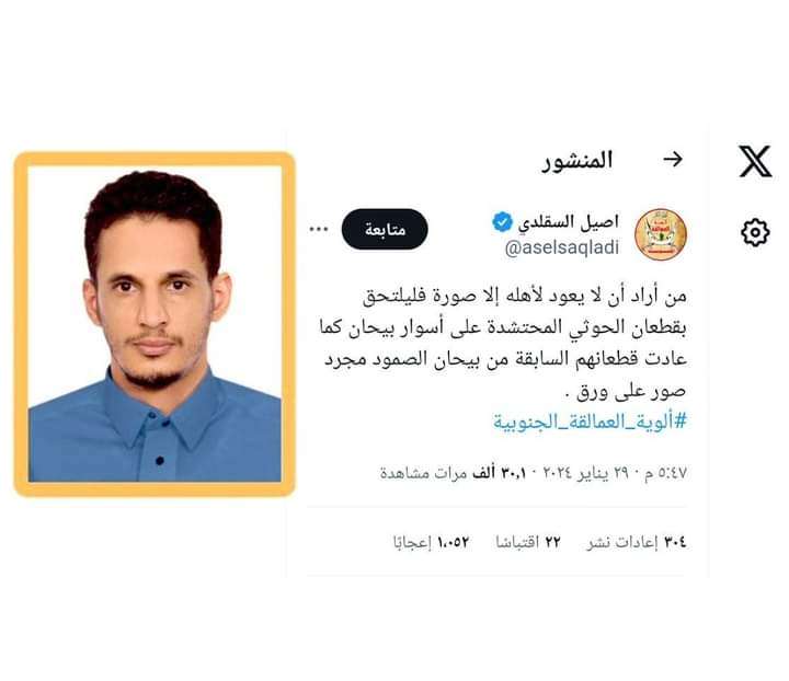 قال ناطق قوات العمالقة الجنوبية "اصيل السقلدي" إن جحافل مليشيات الحوثي الإرهابية المدعومة من إيران، تحتشد على اسوار بيحان وتحاول تعزز ماخسرته من افراد وعتاد وتكرر هجومها ولكنها تباد من قبل فرسان الجنوب الذين يلقنونها دروس في البسالة والشجاعة٠ وقال السقلدي في صفحته الرسمية على منصة "إكسX": ‏من أراد أن لا يعود لأهله إلا صورة فليلتحق بقطعان الحوثي المحتشدة على أسوار بيحان كما عادت قطعانهم السابقة من بيحان الصمود مجرد صور على ورق٠