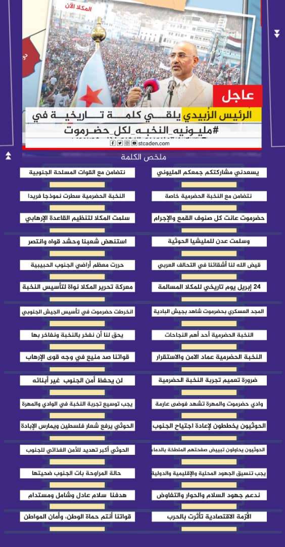 #إنفوجرافيك : أبرز ما ورد في كلمة الرئيس القائد عيدروس الزُبيدي في #مليونيه_النخبه_لكل_حضرموت