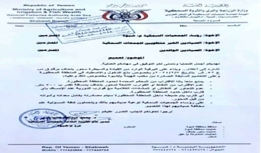 اصدر مدير الهيئة العامة للمصائد السمكية بشبوة يصدر بمنع الاقتراب من المنطقة المحظورة بناء على برقية من قيادة محور بلحاف. وأصدر مدير الهيئة العامة للمصائد السمكية في محافظة شبوة الدكتور محمد الواحدي تعميم للصيادين بشأن عدم الاقتراب من المنطقة المحظورة بناء على برقية من قيادة محور بلحاف بشبوة. وجاء التعميم على النحو التالي: إشارة إلى أعلاه وبناء على البرقية الصادرة من القيادة والسيطرة محور بلحاف ق س ع ٥٢. ش بتاريخ ٧ – ٢- ٢٠٢٤ وأشار الدكتور الواحدي مدير الهيئة العامة للمصائد السمكية بشبوة ياتي هذا القرار في اطار الحفاظ على أرواح الصيادين من عدم المجازفة في الاماكن المحظورة التابعة لمحور بلحاف