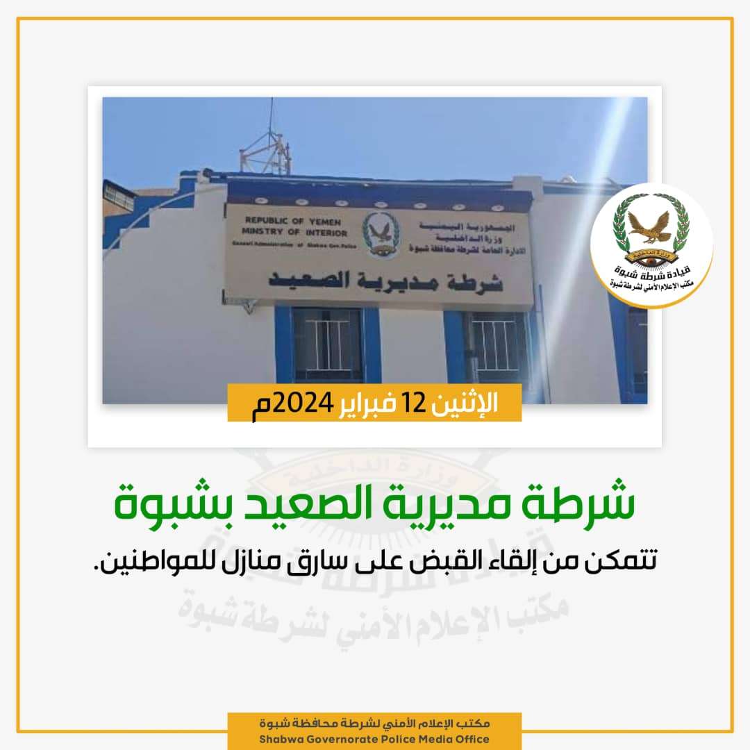 تمكنت شرطة مديرية الصعيد بمحافظة شبوة، مساء اليوم، القبض على شرطة مديرية الصعيد بشبوة، تتمكن من إلقاء القبض على سارق منازل للمواطنين . بعمليات سرقة لعدد من المنازل للمواطنين بمنطقة الشعبة بمديرية الصعيد. وأوضح مدير شرطة الصعيد النقيب عبدالله الطالبي، بتلقيهم بعدد من البلاغات من المواطنين بقيام مجهولين بسرقة منازلهم، من خلال استخدام طرق وأساليب احترافية، مضيفا أن قسم التحريات بدأ التحقيق في تلك البلاغات والتحري لرصد المتهم والقبض عليه. وأشار مدير شرطة الصعيد، بأن التحقيقات أدت لمعرفة هوية المتهم المدعو ،ف، م، ع، ش ،والقبض عليه والتحقيق معه حول عدد من التهم، مؤكدا اعتراف المتهم بالسرقة. وأفاد مدير شرطة الصعيد، باحتجاز المتهم وفتح محضر تحقيق في القضية وفور استكمال التحقيقات سيتم تحويله إلى النيابة لينال عقابه وفقا للنظام والقانون.