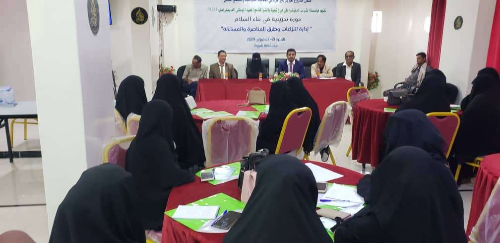 دشن فرع مؤسسة الشباب الديمقراطي بمحافظة شبوة اليوم وبالتعاون مع المعهد الديمقراطي دورة نسوية في مجال بناء السلام بمشاركة عشرين مشاركة من مديرية نصاب ، وذلك في اطار مشروع تعزيز دور المرأة في العملية السياسية والمجتمع المدني وبناء السلام . وتهدف الدورة الى تعريف المشاركات بكيفية ادارة النزاعات وطرق المناصرة و المساءلة ، و تعريفهن بالقرار الاممي 13/25 واتفاقيات السلام . وخلال التدشين اكد الوكيل المساعد للمحافظة سالم النسي اهتمام قيادة المحافظة ممثلة بمحافظها الشيخ عوض ابن الوزير ، بهذه البرامج النوعية التي تستهدف تطوير قدرات المرأة الشبوانية ، وتساهم في زيادة مشاركتها في الشؤون العامة ، و مختلف مجالات العمل والانتاج ، مؤكدا على دورها في تحسين مستويات حياتها الاسرية والمعيشية والعملية . واوضح رئيس فرع المؤسسة ماجد الدويل استهداف المشروع لستين امرأة في مديريات عتق ونصاب و بيحان ، وذلك لاعدادهن للاضطلاع بدورهن في مختلف مراحل اعادة البناء الاجتماعي و السياسي والسلام . حضر التدشين نائب رئيس جامعة شبوة الدكتور محسن باحاج ، ونائب مدير مكتب العمل والشؤون الاجتماعية ناصر لشدف .