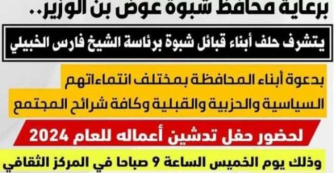 حلف أبناء قبائل شبوة يوجه دعوة لأبناء شبوة لحضور حفل تدشين أعماله للعام 2024