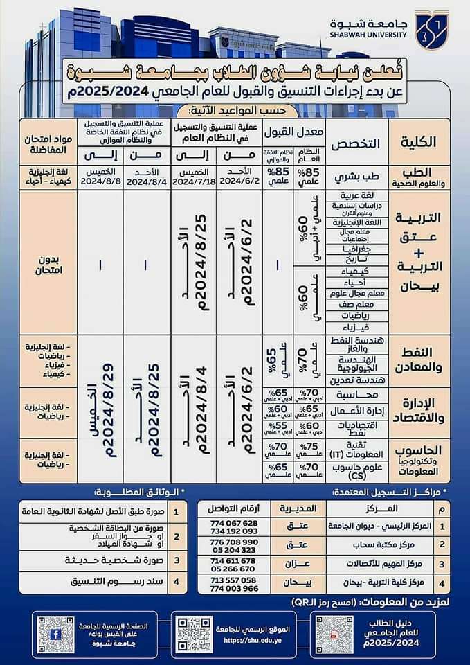 نيابة شؤون الطلاب جامعة شبوة تعلن بدء إجراءات التنسيق والقبول للعام الجامعي 2024 – 2025 م.