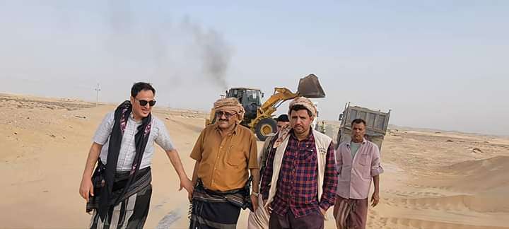 وكيل المحافظة يتفقد أعمال إزاحة الرمال المتحركة من الطريق الدولي عتق- المكلا بمنطقة النشيمه رضوم