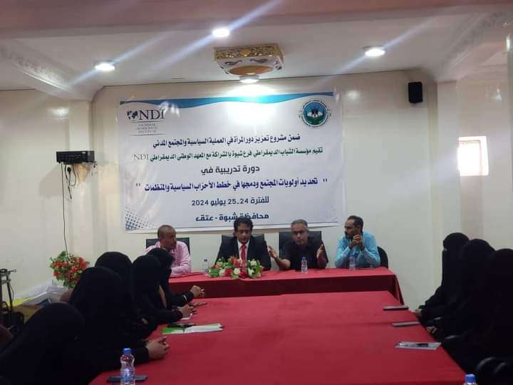مؤسسة الشباب الديمقراطي بشبوة" تدشن دورة تدريبية حول "تحديد أولويات المجتمع ودمجها في خطط الأحزاب والمنظمات" بمدينة عتق