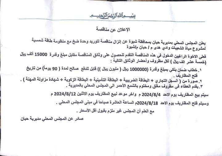 حبان شبوة : إنزال مناقصة لتوريد وتركيب وحدة ضخ مع منظومة طاقة شمسية لمشروع الشعيبات