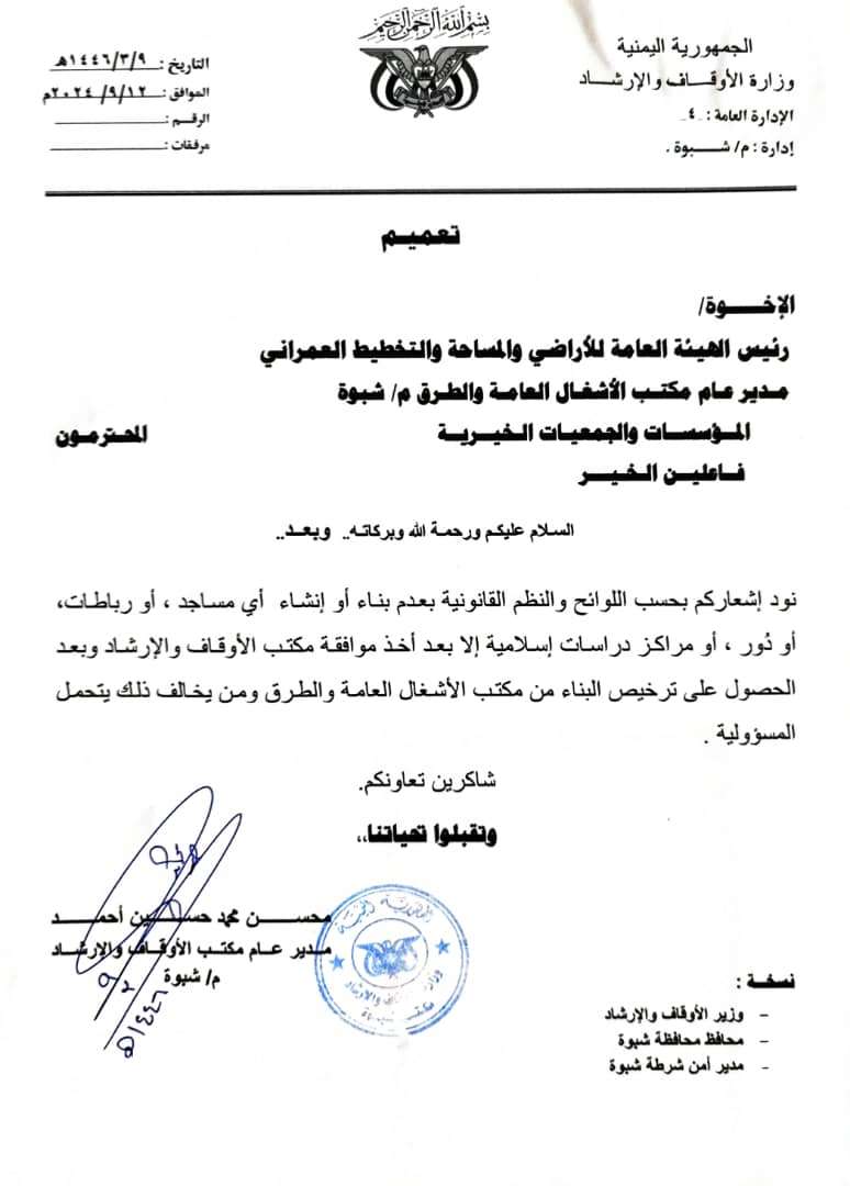 مدير عام أوقاف شبوة يصدر تعميماً بعدم بناء وإنشاء المساجد والمراكز العلمية إلا بعد موافقة مكتبه