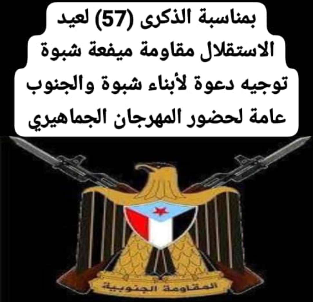 بمناسبة الذكرى (57) لعيد الاستقلال مقاومة ميفعة شبوة توجيه دعوة لأبناء شبوة والجنوب عامة لحضور المهرجان الجماهيري