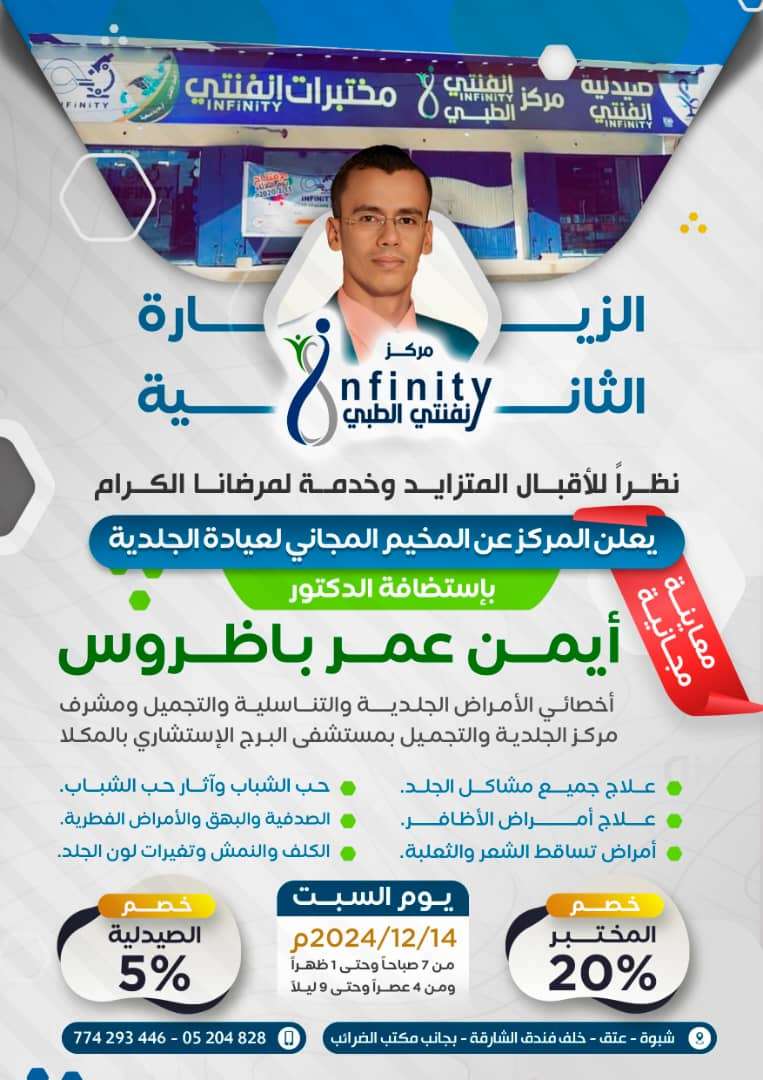 يعلن مركز ومختبرات إنفتي في عتق عن تنظيم مخيم مجاني للمرة الثانيه متخصص في الأمراض الجلدية، وذلك باءستضافة الدكتور عمر باظروس، أخصائي الأمراض الجلدية والتناسلية. سيتم تقديم خصومات خاصة في المختبر والصيدلية خلال فترة المخيم. تدشين المخيم الثاني سيكون يوم السبت 14 ديسمبر 2024، في عتق، خلف فندق الشارقة، بجوار مكتب الضرائب. ت ثابت 05204828 جوال 774293446 ندعو الجميع للاستفادة من هذه الفرصة القيمة!