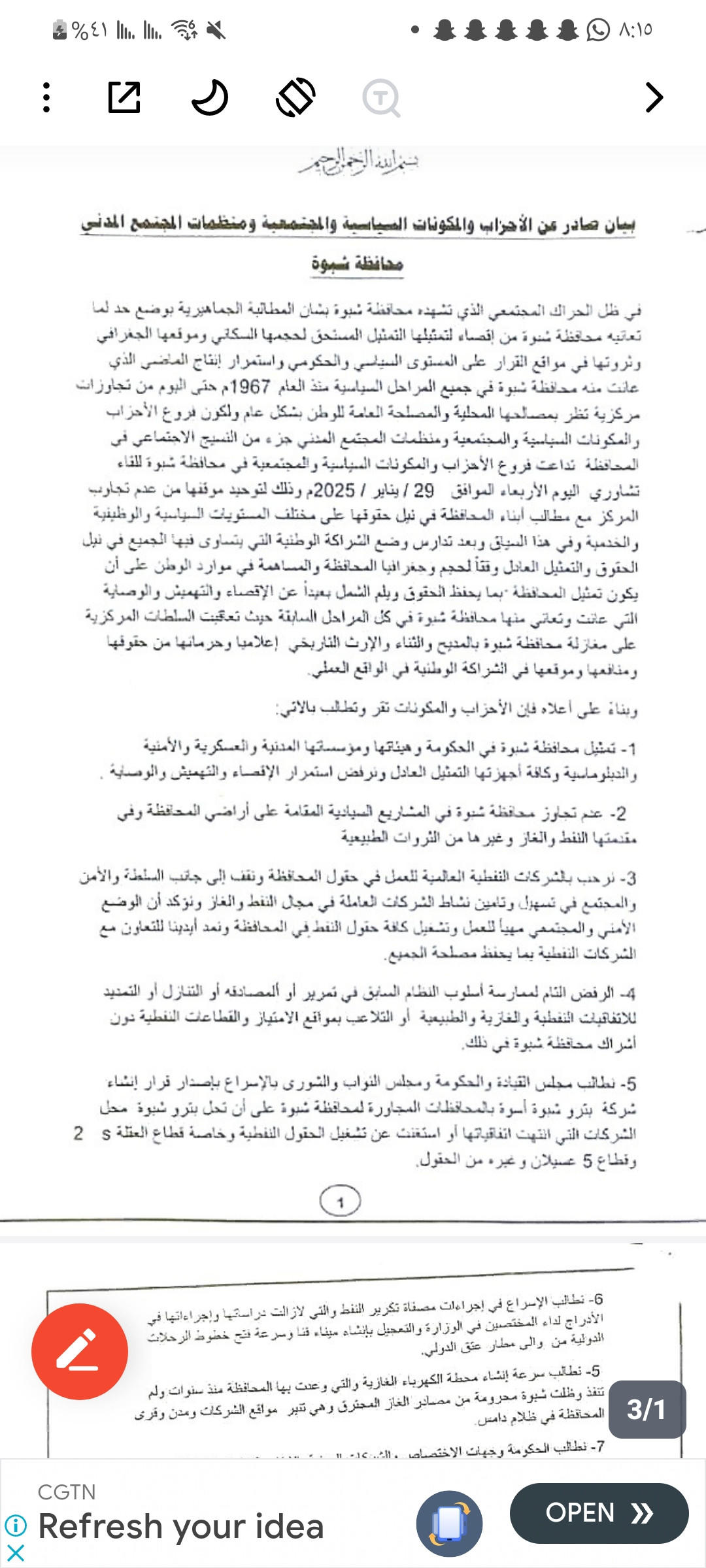 الأحزاب والمنظمات السياسية ومؤسسات المجتمع المدني بمحافظة شبوة تصدر بيانًا هامًا