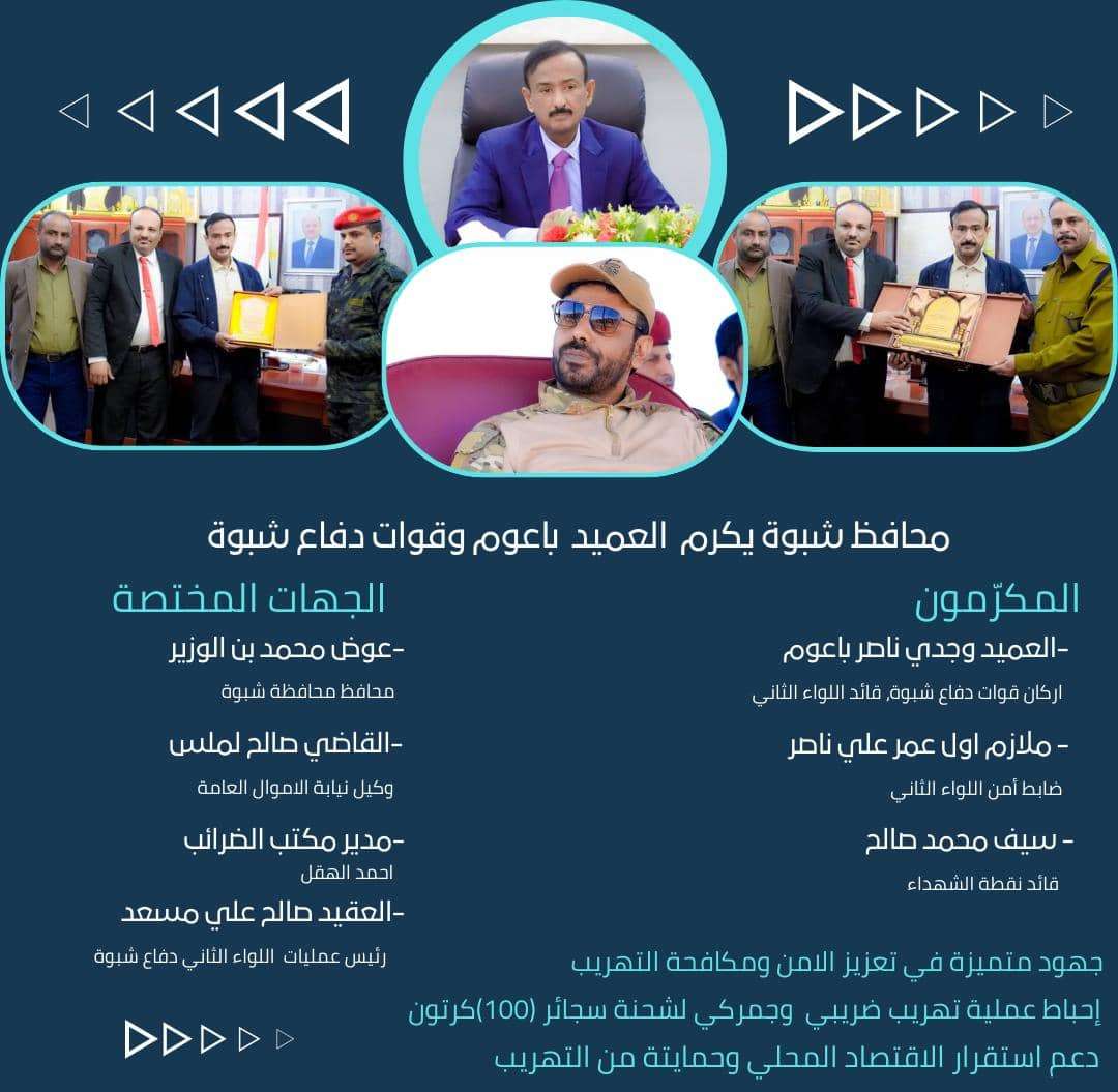 محافظ شبوة يكرّم العميد باعوم وقوات دفاع شبوة لجهودها في تعزيز الأمن ومكافحة التهريب