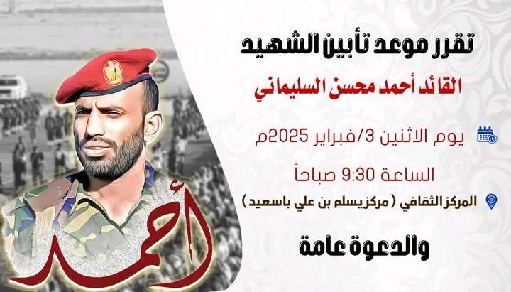 شبوة تستعد لإقامة حفل تأبين الشهيد القائد أحمد محسن السليماني غدآ الإثنين 3 فبراير 2025م