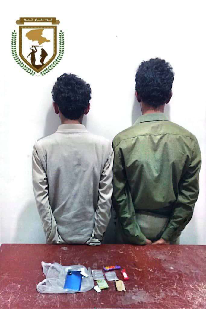 قوات دفاع شبوة تلقي القبض على ثلاثة أشخاص وبحوزتهم كمية من مادة الشبو في مدخل مدينة عتق