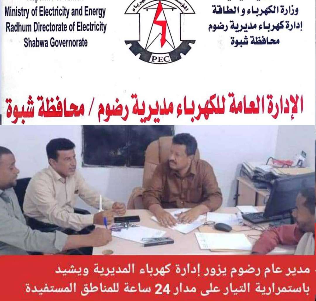 مدير عام رضوم يزور إدارة كهرباء المديرية ويشيد باستمرارية التيار على مدار 24 ساعة للمناطق المستفيدة