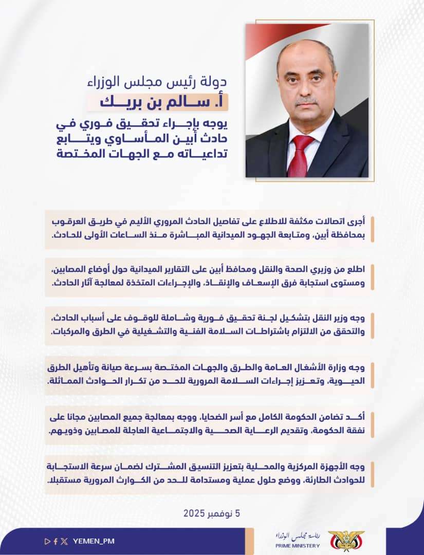 ​دولة رئيس مجلس الوزراء الأستاذ سالم صالح بن بريك يوجه بإجراء تحقيق فوري في حادث أبين المأساوي ويتابع تداعياته مع الجهات المختصة. ​(يأتي هذا التوجيه في إطار المتابعة الحكومية والقيادية لفاجعة احتراق باص النقل الجماعي في نقيل العرقوب بمحافظة أبين، لضمان الكشف عن ملابسات الحادث واتخاذ الإجراءات اللازمة لتقديم الرعاية لضحاياه وتجنب تكرار مثل هذه المآسي.)