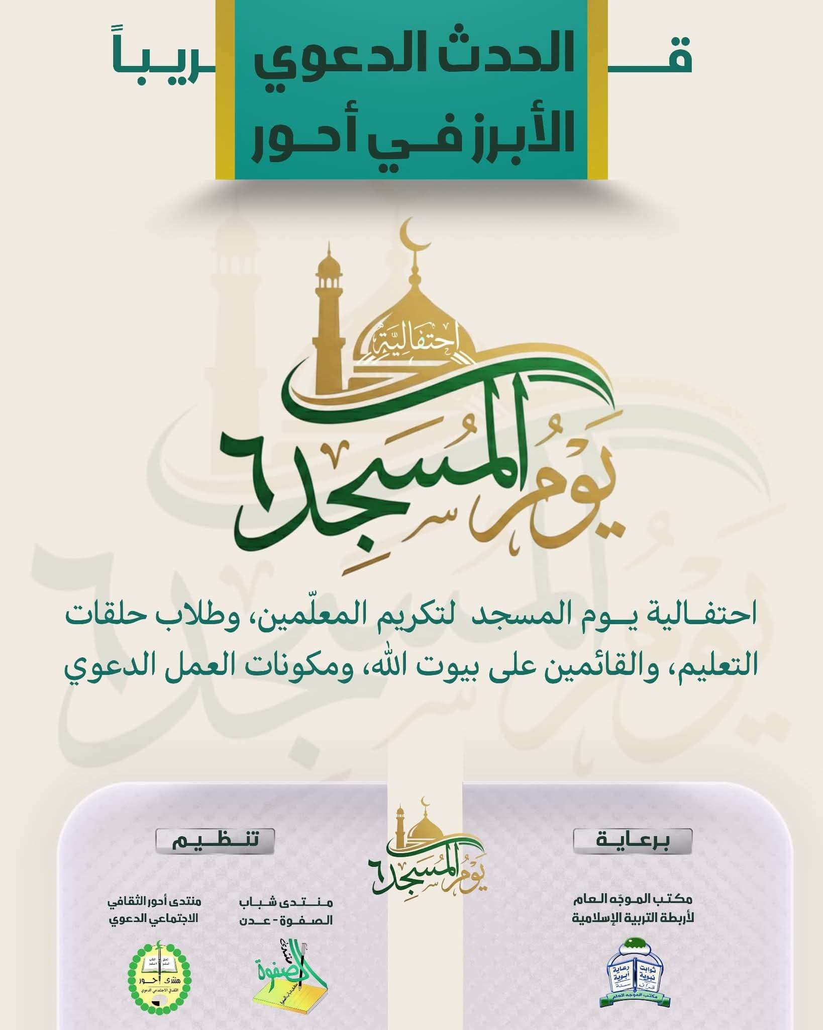 تستعد مدينة أحور خلال الأسبوع المقبل لاحتضان احتفالية يوم المسجد الكبرى تحت شعار (إعلاء رسالة المسجد وسيلة لتحصين الجيل ونشر الفضيلة والأمان في المجتمع)، والتي تُقام للعام السادس على التوالي، حيث سيحتضن جامع لصور في منطقة جول مهدي يوم الجمعة بعد القادمة الفعالية بين صلاتي المغرب والعشاء. الاحتفالية ستشمل تكريم أكثر من "350 فردًا" من معلمي حلقات التعليم بالمساجد، والأئمة، والمؤذنين، والقائمين على خدمة بيوت الله، والمنتمين لمكونات العمل الدعوي بأحور. بالإضافة إلى تكريم أكثر من "600 طالب" في حلقات التعليم الأبوي في جميع مساجد مديرية أحور. الفعاليات سيتبع الحفل التكريمي ندوة تأبينية عن الأستاذ الراحل علي صالح مهدي ضمن مهرجان يوم المسجد، وذلك في ساحة المنتدى، بحضور عدد من الدعاة وجمع غفير من الأهالي. سيتخلل الندوة عرض عبر جهاز البروجكتر يتحدث عن الفقيد وإسهاماته الدعوية، بالإضافة إلى الكلمات والقصائد الشعرية. كما ستستقبل مدينة أحور صباح يوم الجمعة عددًا من الدعاة والمشائخ من مدينة عدن للمشاركة في هذا المهرجان الكبير، وسيتم ترتيب عدد منهم للخطابة في عموم جوامع مديرية أحور ضمن برنامج يوم المسجد. أهداف الاحتفالية يأتي هذا التكريم الكبير نظيرًا لبروز مدينة أحور بروزًا مميزًا في الاهتمام بالتعليم الأبوي النبوي الشرعي، اهتمامًا كبيرًا نتج عنه توجه معظم الشباب إلى الأربطة الإسلامية والمساجد ودور القرآن الكريم، والتحاق البعض بالمكونات الدعوية الأخرى. المنظمون تقام فعاليات يوم المسجد في مدينة أحور للمرة السادسة على التوالي، بدعم من منتدى شباب الصفوة بمدينة عدن، وتنظيم منتدى أحور الثقافي الاجتماعي الدعوي، وبرعاية مجلس مكتب الموجه العام لأربطة التربية الإسلامية ومراكزها التعليمية والمهنية.