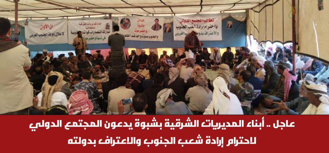 عاجل .. أبناء المديريات الشرقية بشبوة يدعون المجتمع الدولي لاحترام إرادة شعب الجنوب والاعتراف بدولته