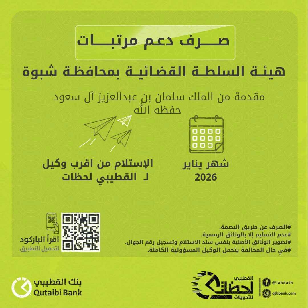 أعلنت هيئة السلطة القضائية بمحافظة شبوة، اليوم، عن بدء عملية صرف دعم المرتبات لموظفيها لشهر يناير 2026م، والمقدم كمنحة من خادم الحرمين الشريفين الملك سلمان بن عبد العزيز آل سعود. وأوضح الإعلان أن عملية الصرف ستتم عبر بنك القطيبي الإسلامي ومن خلال شبكة وكلاء "لحظات للتحويلات" المنتشرة في عموم المحافظة، لضمان وصول المستحقات للمستفيدين بكل سهولة ويسر. وضعت الهيئة والبنك عدداً من الضوابط لإتمام عملية الاستلام، وهي: * الصرف حصرياً عبر نظام البصمة. * ضرورة إحضار الوثائق الرسمية الأصلية (البطاقة الشخصية أو جواز السفر). * تصوير الوثائق الأصلية عند الاستلام وتسجيل رقم الجوال المعتمد. * تأكيد المسؤولية الكاملة للوكلاء في حال مخالفة إجراءات الصرف المعتمدة. يأتي هذا الدعم في إطار الجهود المستمرة لتسهيل مهام السلطة القضائية وتعزيز استقرار العمل في المؤسسات الرسمية بمحافظة شبوة.