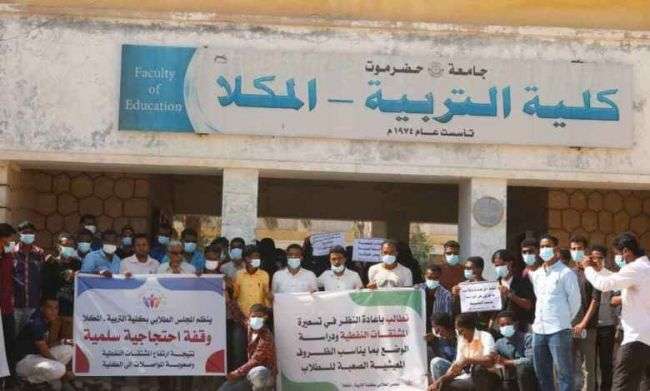 نظم طلاب وطالبات كلية التربية بجامعة حضرموت وقفة احتجاجية سلمية أمام مقر الكلية ضد إرتفاع المشتقات النفطية التي أثرت بشكل كبير على الطالب مما أدى إلى عدم حضوره للكلية .